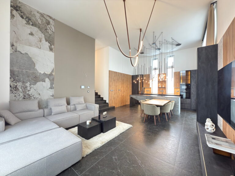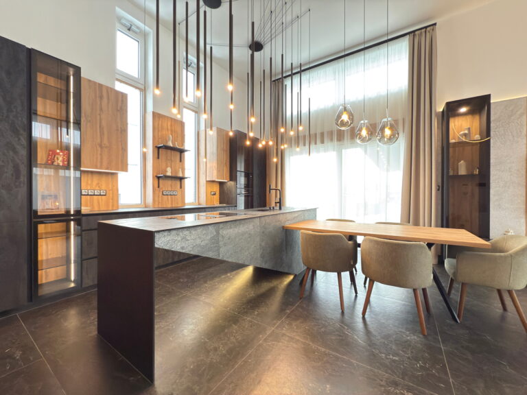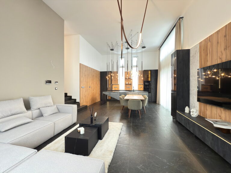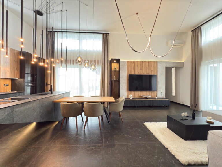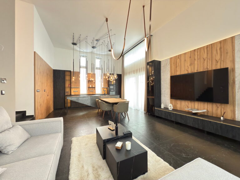 - Tágas, nagy belmagasságú amerikai konyhás nappali–étkező