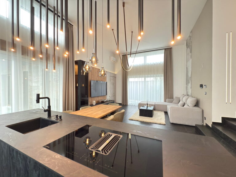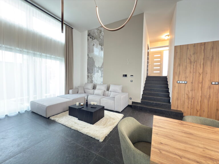 A ház belső kialakítását a szinteltolás, az extra belmagasság és a letisztult design határozza meg, mely egyszerre vagány és elegáns atmoszférát teremt.