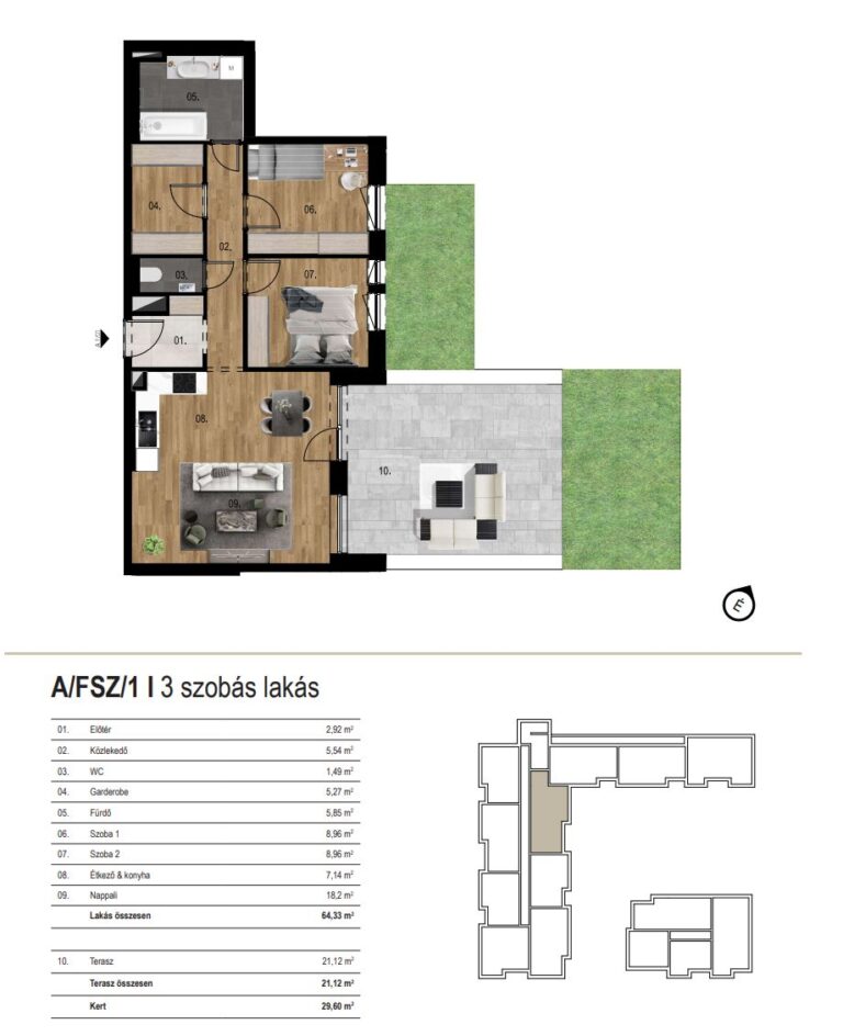 Győr Vizivárosban, modern, liftes társasházban eladó KULCSRAKÉSZ állapotú, amerikai konyha-nappali + 1 szobás, illetve nappali + 2 szobás, privát kertkapcsolattal rendelkező lakás.