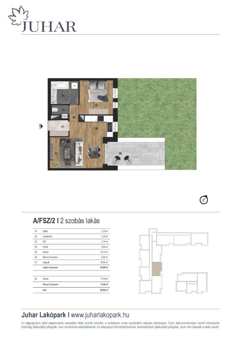 Lakótér: 46 m2, kert: 68 m2