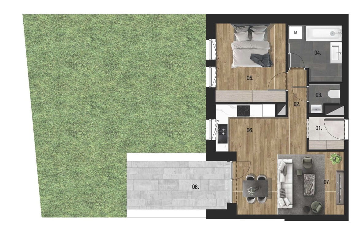 Amerikai konyha-nappali + 1 szobás, privát kertkapcsolattal rendelkező lakás.