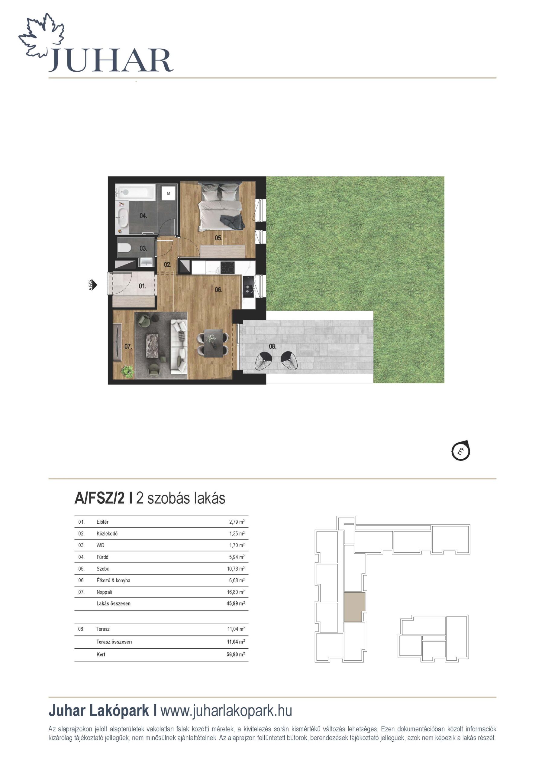 Lakótér: 46 m2, kert: 68 m2