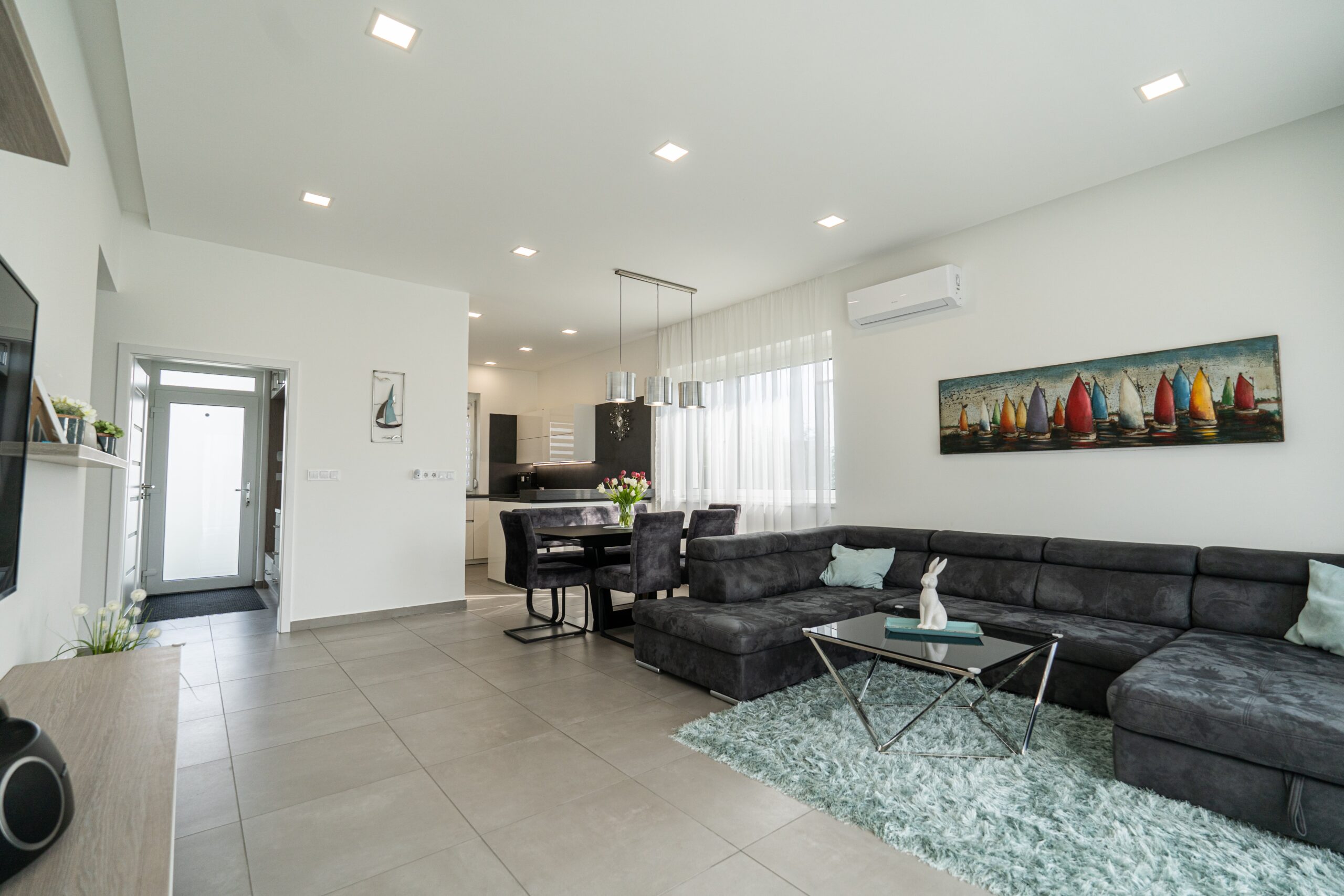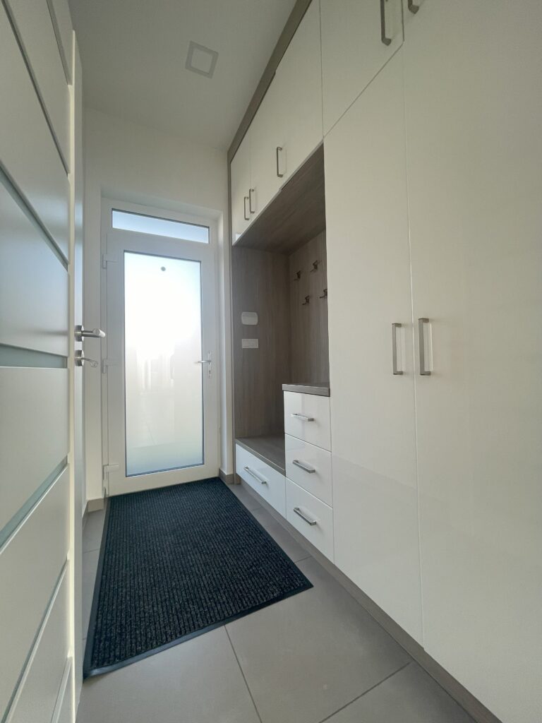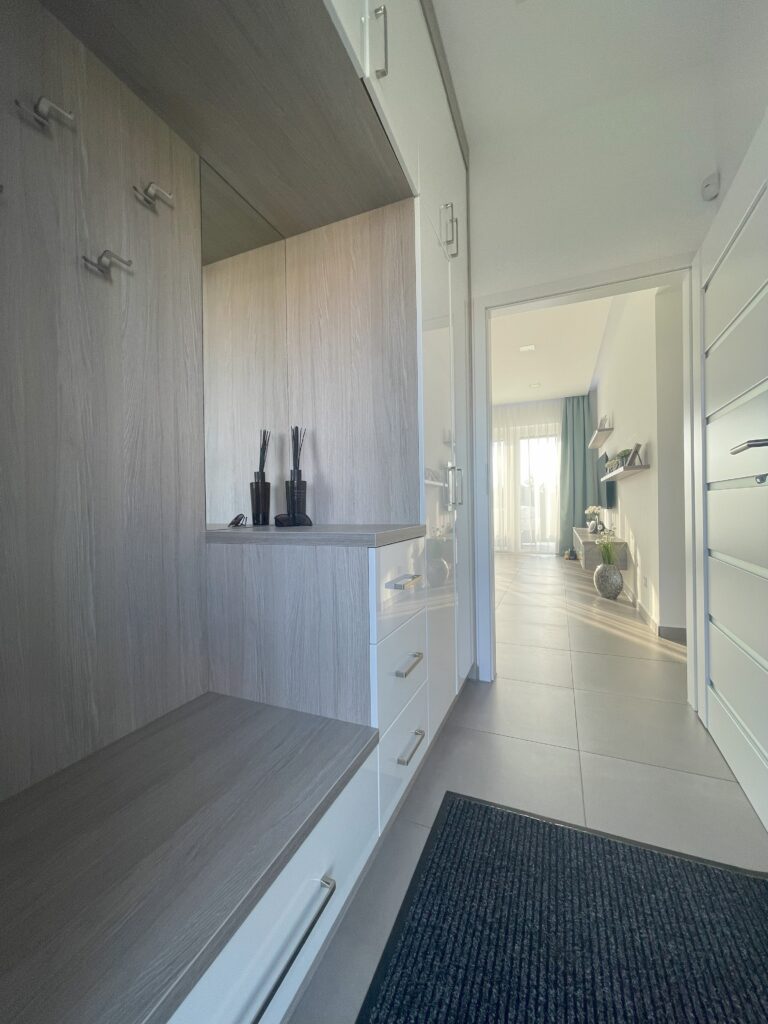 A lakótérben valamennyi beépített bútor azonos színvilágban, egységes designban készült, így a ház minden szeglete tökéletes harmóniában áll egymással.