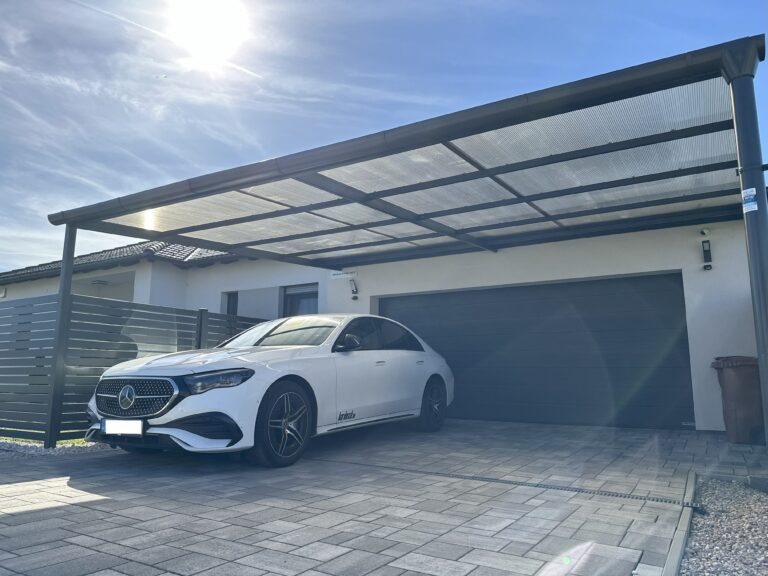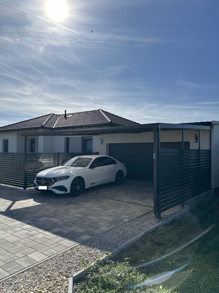 - 39 m2-es dupla garázs, vízvételi lehetőséggel, tároló helyekkel, valamint a garázs előtt további két autó számára fedett beállóhellyel