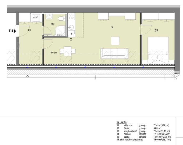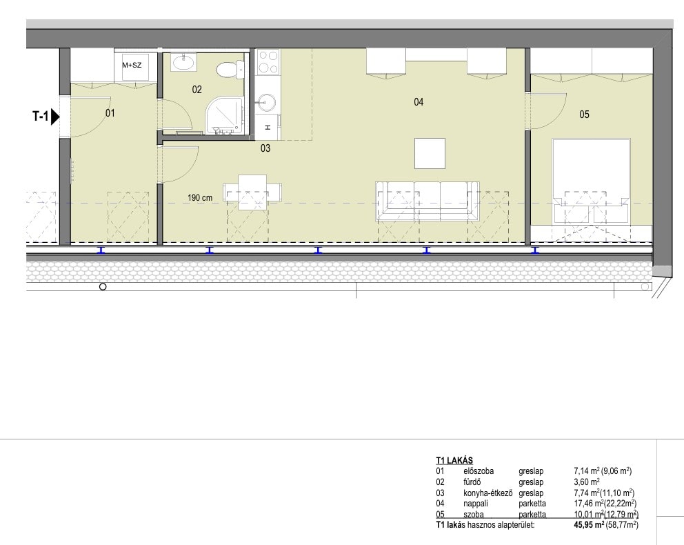 Első emelet 1-es lakás: 57,41 m2 + 9,32 terasz: 59.587.000 Ft