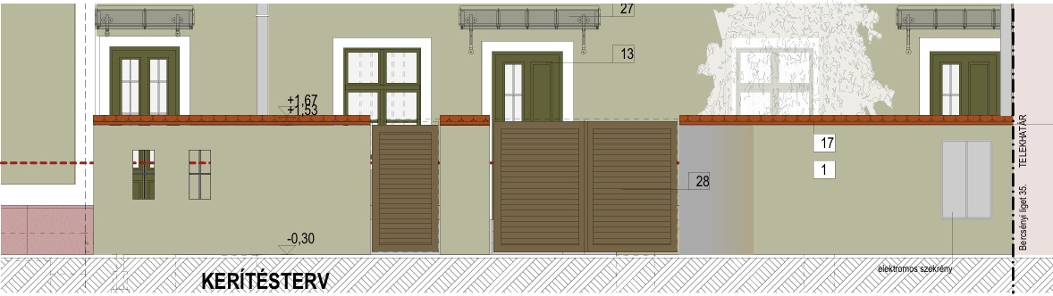 Az üzlethelyiségek közvetlen utcafronti bejárattal rendelkeznek, míg az udvarban kialakítandó három földszinti lakáshoz saját használatú terasz tervezett, ezek vizuális lehatárolása a teraszok szélén lévő cserjékkel történik, az udvar közepén közepes lombú fa tervezett, mely jelentős pozitívumot jelent az udvar mikroklímája szempontjából.